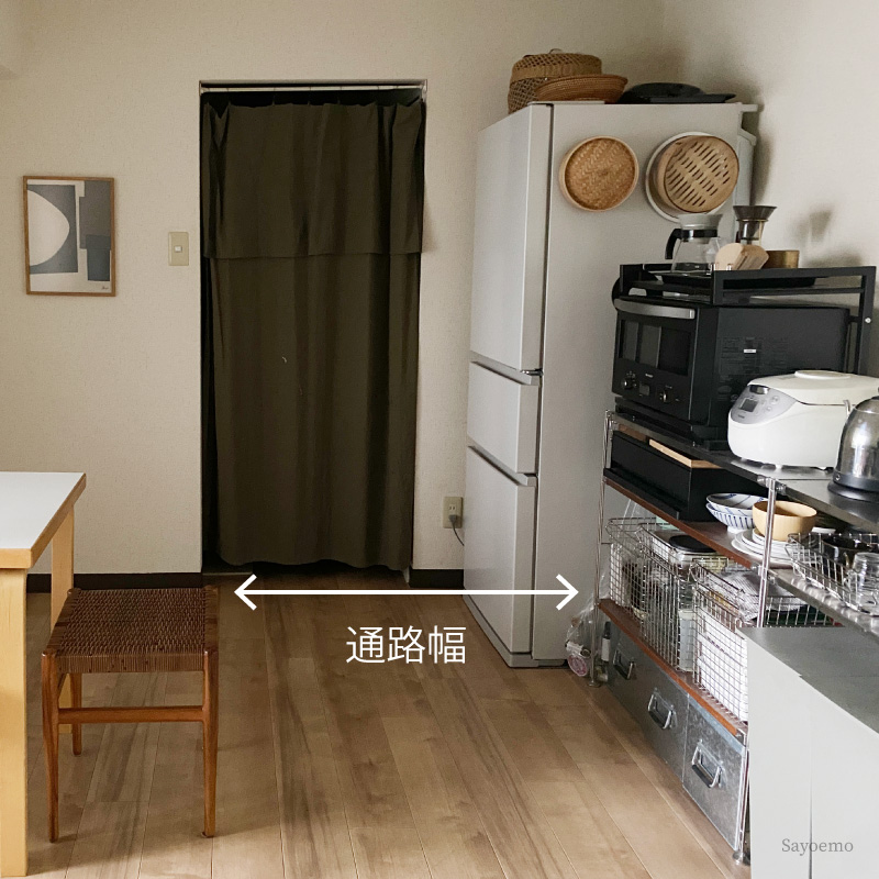 ちなみにわが家の場合、スツールに座っている状態の通路幅は約90cm、スツールをテーブル下に収納した状態では約120cmを確保できています。