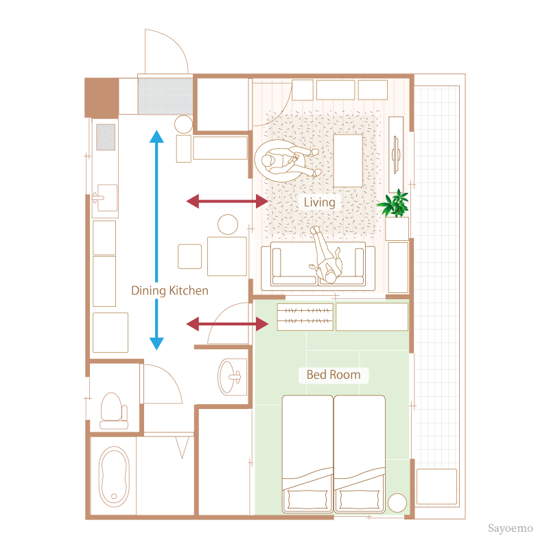 家具配置で最も大切なのは、生活動線を確保することです。特に「玄関からDKを通って各部屋へ」という間取りでは、DKが家の中心的な通路になります。