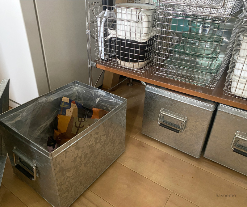 金物やビン、ガラス、埋め立てゴミなど、月に1〜2回しか回収がないゴミは、シェルフ最下段の左側に置いた「無印良品のトタンボックス」に一時保管しています。