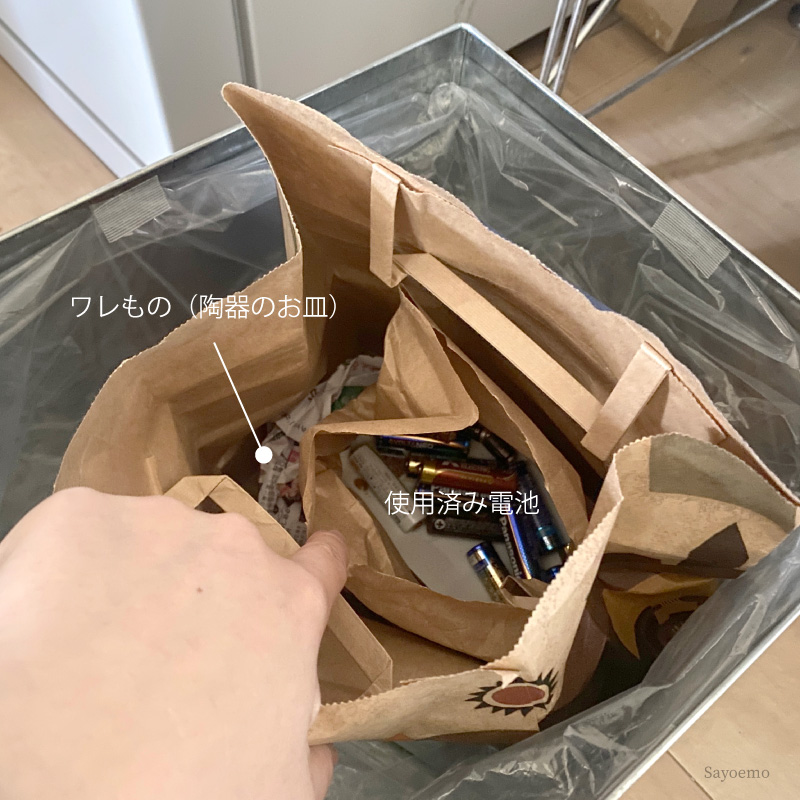 金物、ガラス類はそのままボックスへ入れ、埋め立てゴミだけは紙袋に小分けして。