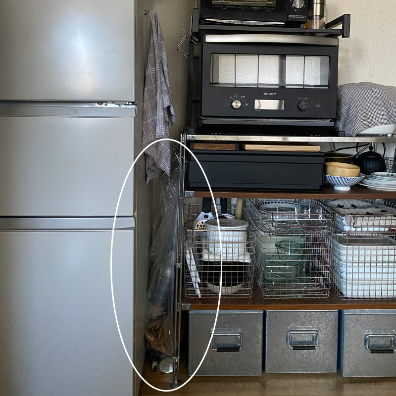 以前は、冷蔵庫とシェルフのわずかな隙間にゴミ袋を掛けてしのいでいました。