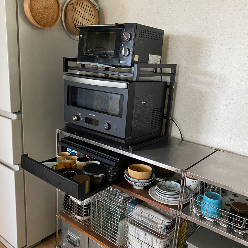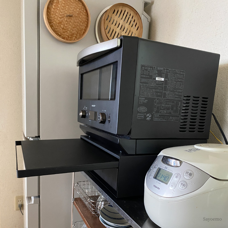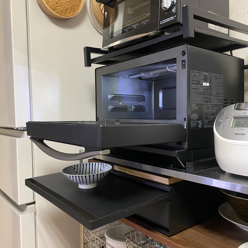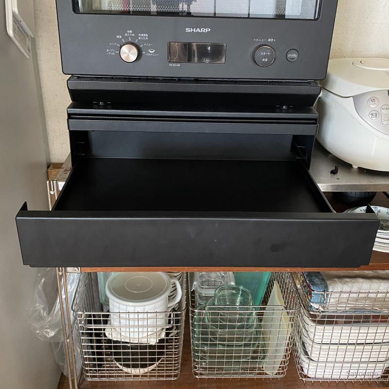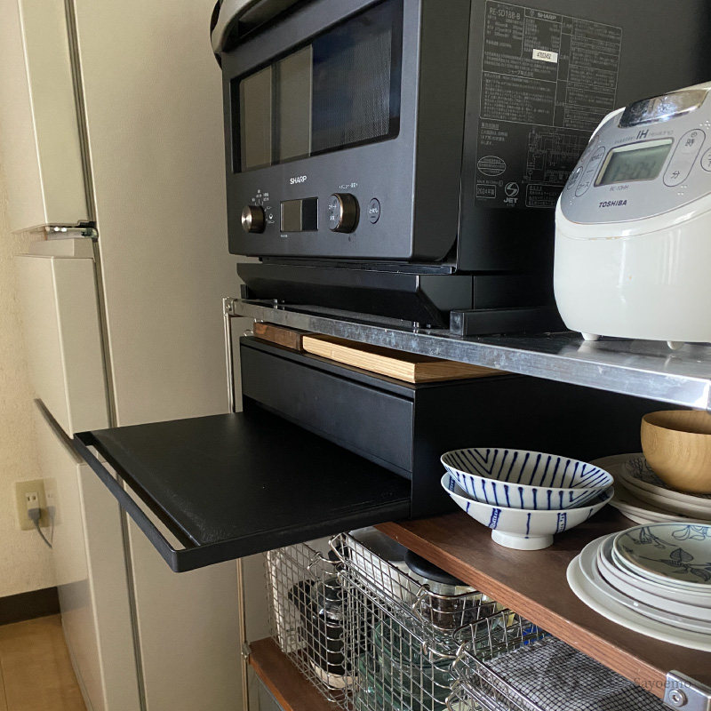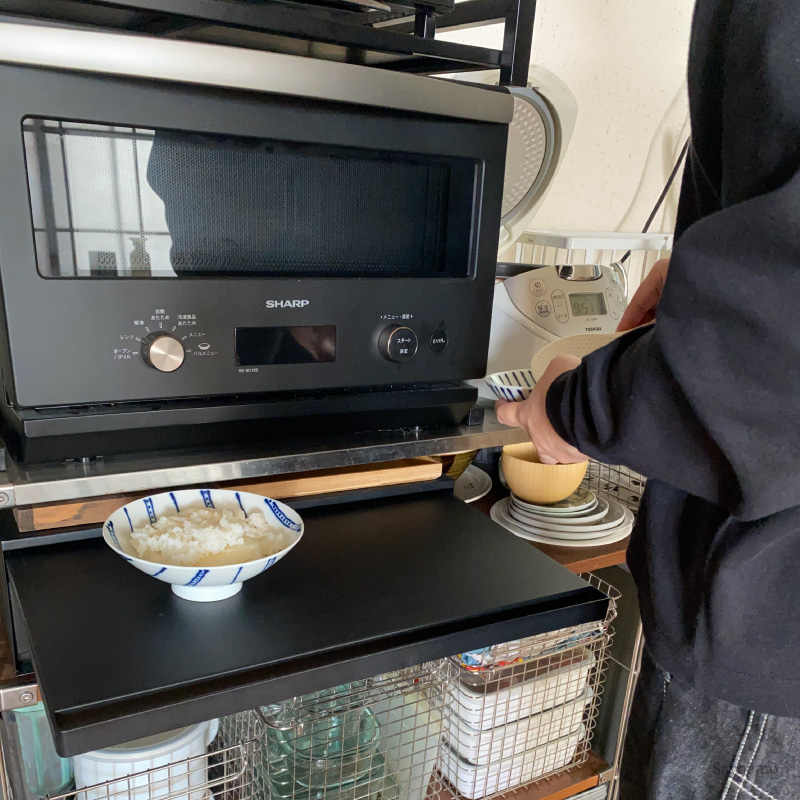 また、スライドテーブルを上側に設置しているのですが(下に設置すると作業台として使うには高さが低い)電子レンジの扉を開けてもスライドテーブルに置いた食器にぶつからずに使える点も気に入っています。