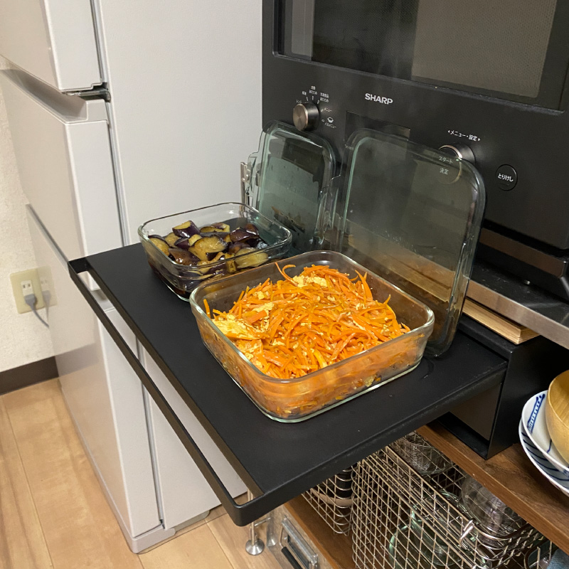 サッと引き出すだけで熱い保存容器の一時置き場になるため、作り置きの作業がスムーズになり、助かっています