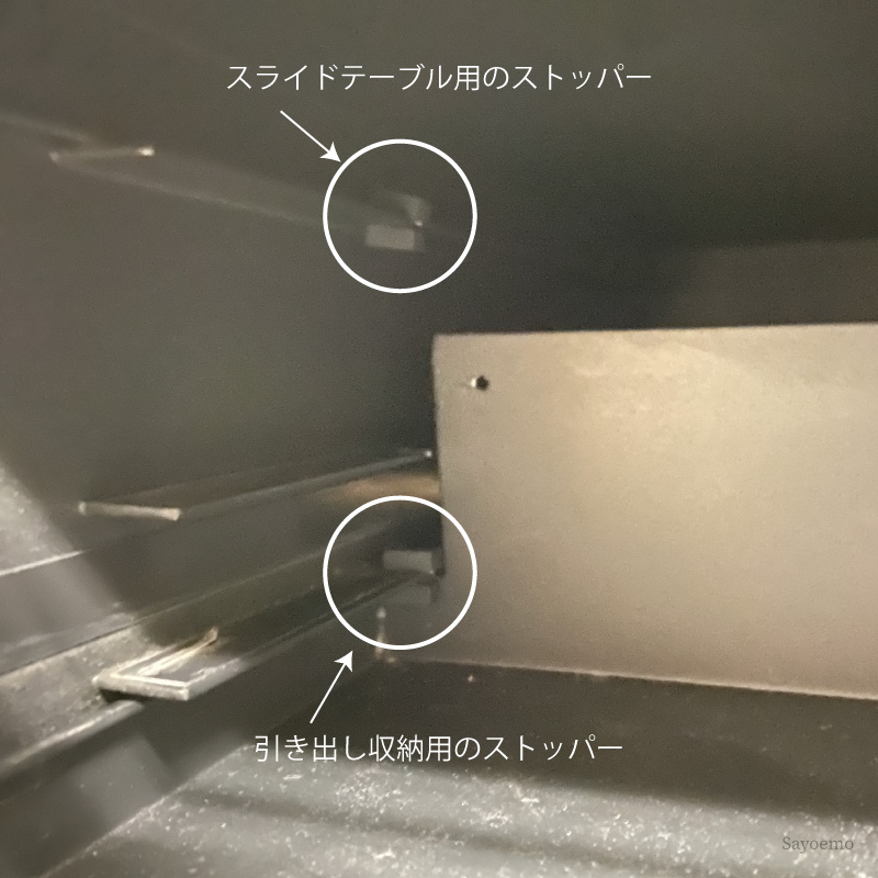 ストッパーの取り付けは、スライドテーブルと引き出しの両方に、忘れずに行ってください。