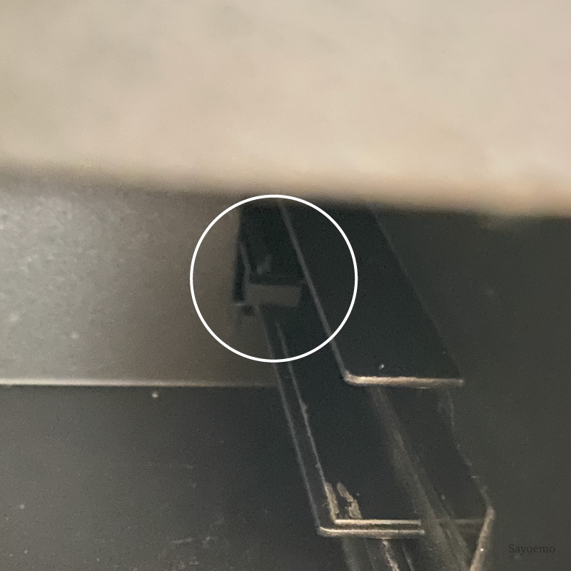 引き出しとスライドテーブルの両方の抜け落ちを防ぐための安全パーツです。