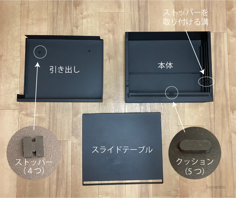 この製品には、スライドテーブルや引き出しの落下を防ぐための小さなゴム製のストッパーが付いています。このストッパーをしっかり取り付けておかないと、うっかり引き出しすぎた際に落下する危険があります。