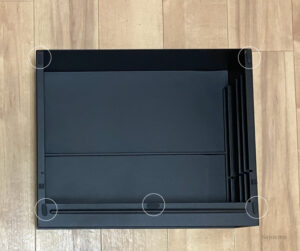 これはわが家の設置環境によるものですが、無印良品のユニットシェルフなど、比較的軽量な棚に設置している場合、引き出しやスライドテーブルを開け閉めした際の重さの移動で棚全体が結構揺れます。