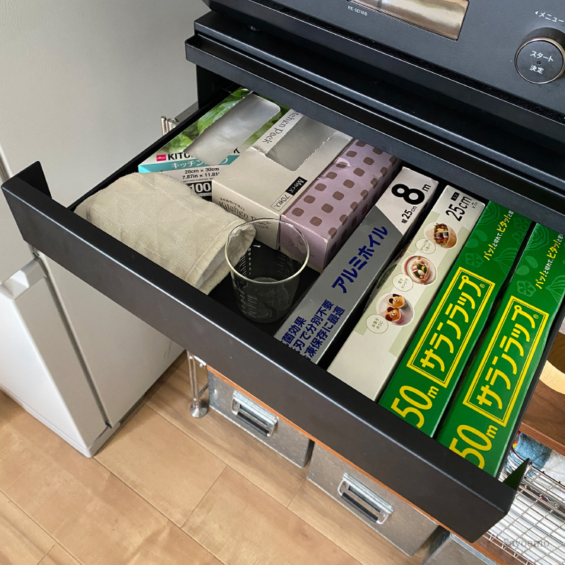 ちなみに、以前引き出しに入れていたラップやアルミホイルは、現在こちらのラックに移動しました。生活感は出てしまいますが、引き出しに収納するよりもサッと取り出せるため、使い勝手は上々です。