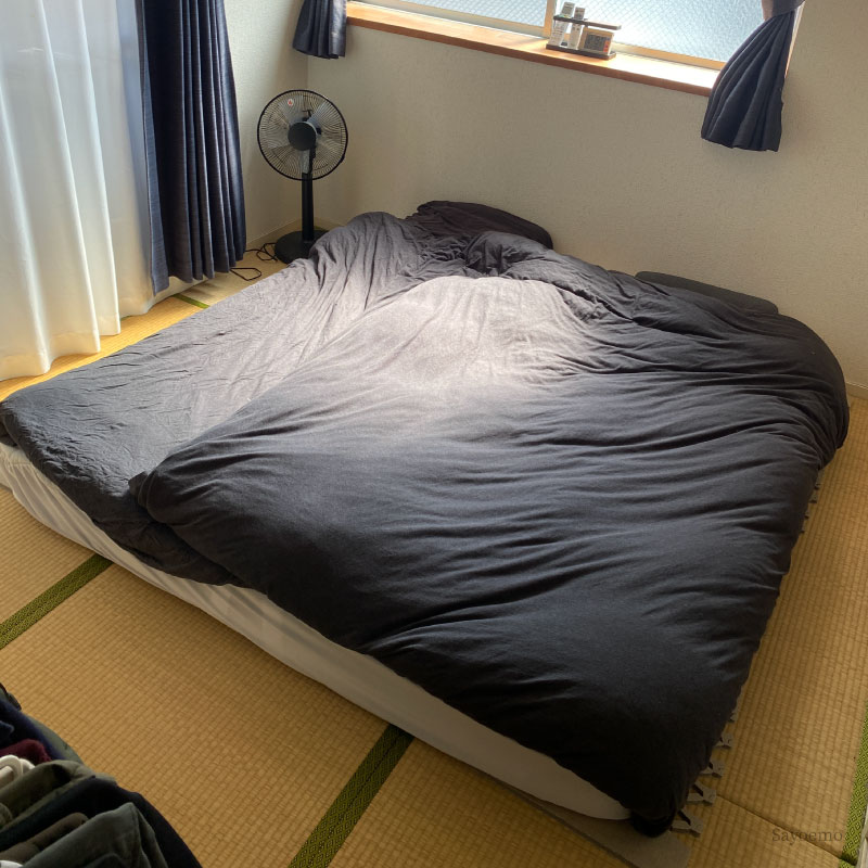 敷布団であればぴったりなのですが、マットレスだとこのサイズ感が原因で生活感が出てしまうのは避けられません。「おしゃれより実用性」と割り切って使っています。
