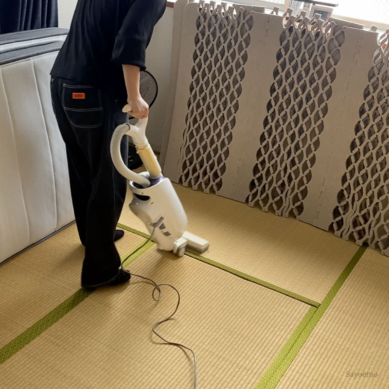 このルーティンが続いている最大の理由は、立てかけ作業が全く負担にならないこと。すのこマット自体が軽量で、さらにマットレスをシングル2台に分けているおかげです。そこまで重くないので比較的ラクに動かせますし、ホコリが溜まりやすい床の隅々まで掃除機をかけることができます。