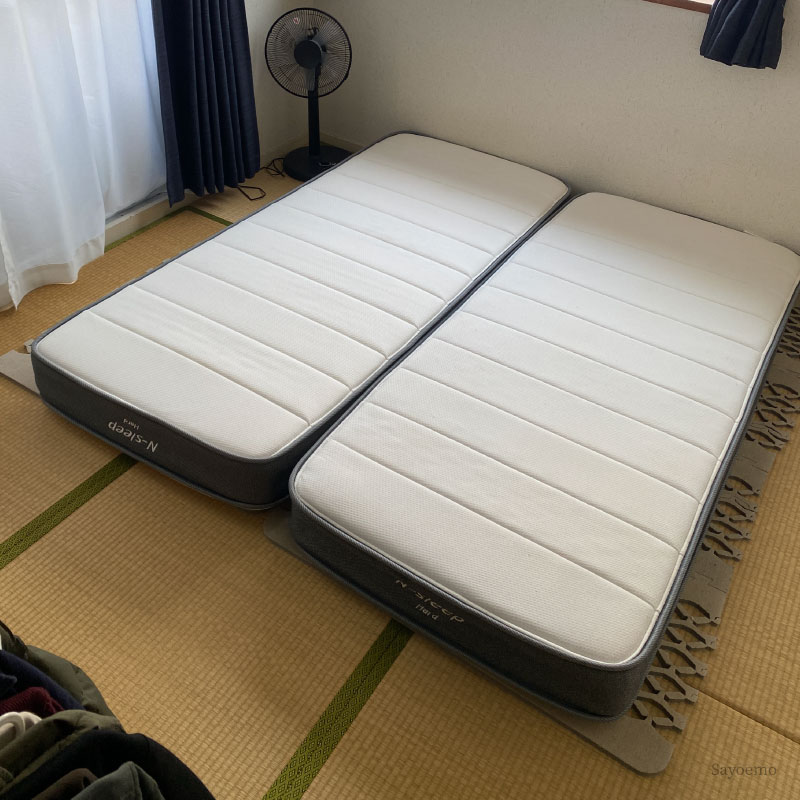 現在、ニトリのシングルマットレスを2台並べて直置きしていますが、その下にエアジョブプラスを敷いています。