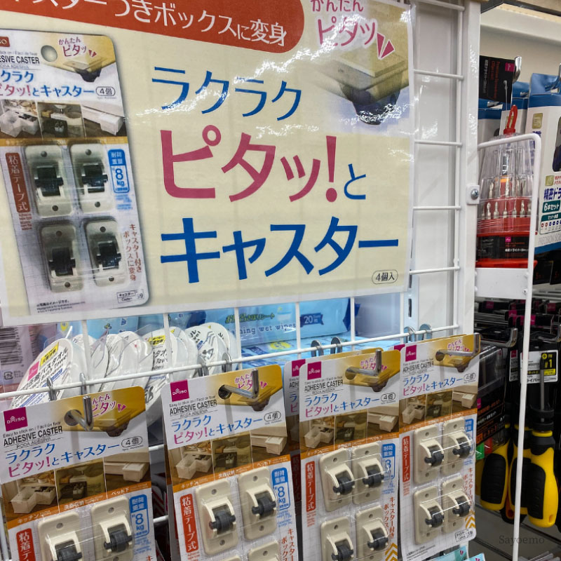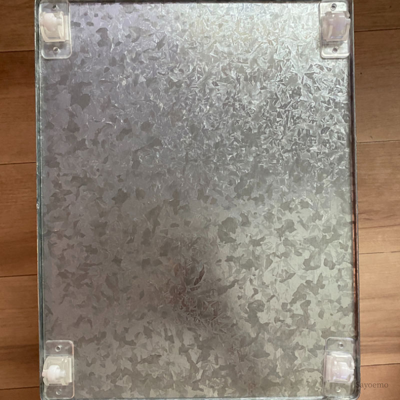 重くなるトタンボックスの底に、ダイソーの「らくらくピタッとキャスター」をつけたら、出し入れが驚くほどスムーズになりました。