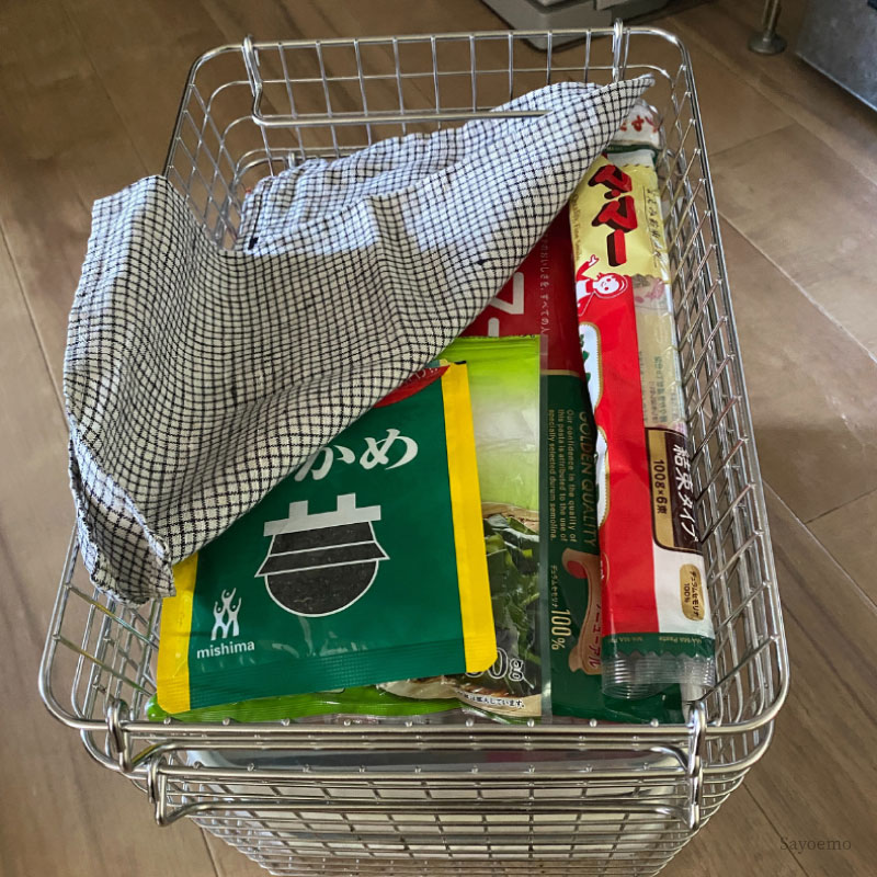 よく使うものは、浅いバスケットに入れて。深型タイプと浅型タイプを重ねて使えるのが便利です。