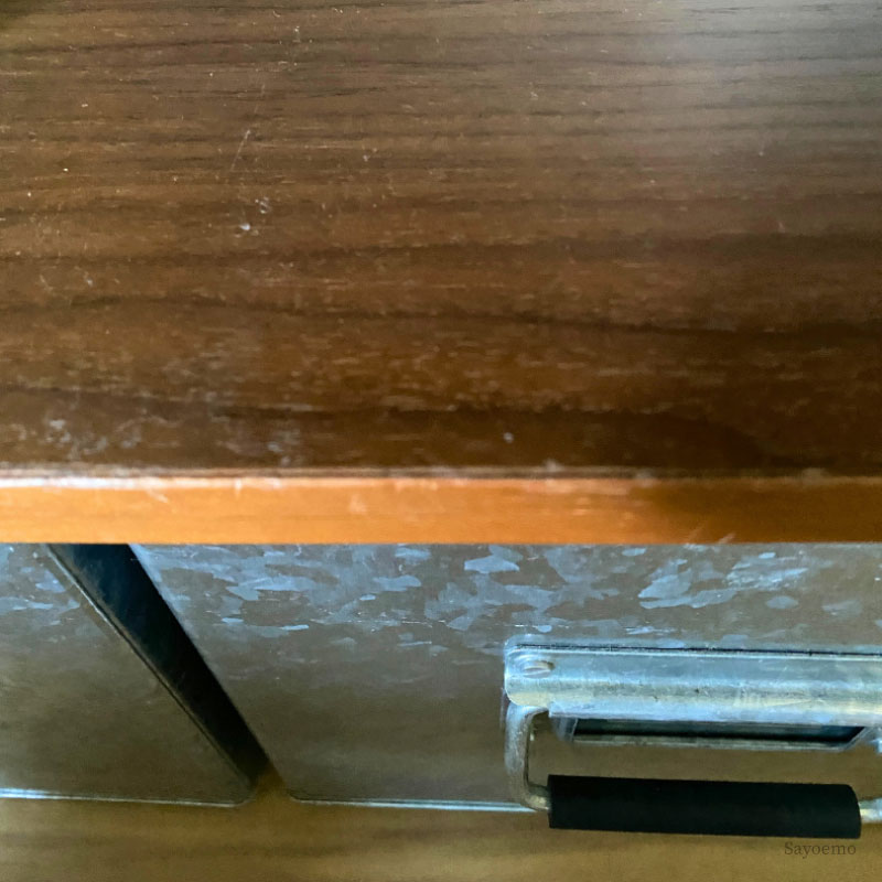 私はステンレスと木の組み合わせが気に入っていましたが、重いものを乗せた木製の棚板がたわんでしまったこと、そして、ワイヤーバスケットを直接置いて引き出す際に、棚板表面に摩擦による深い傷がついてしまったことです。